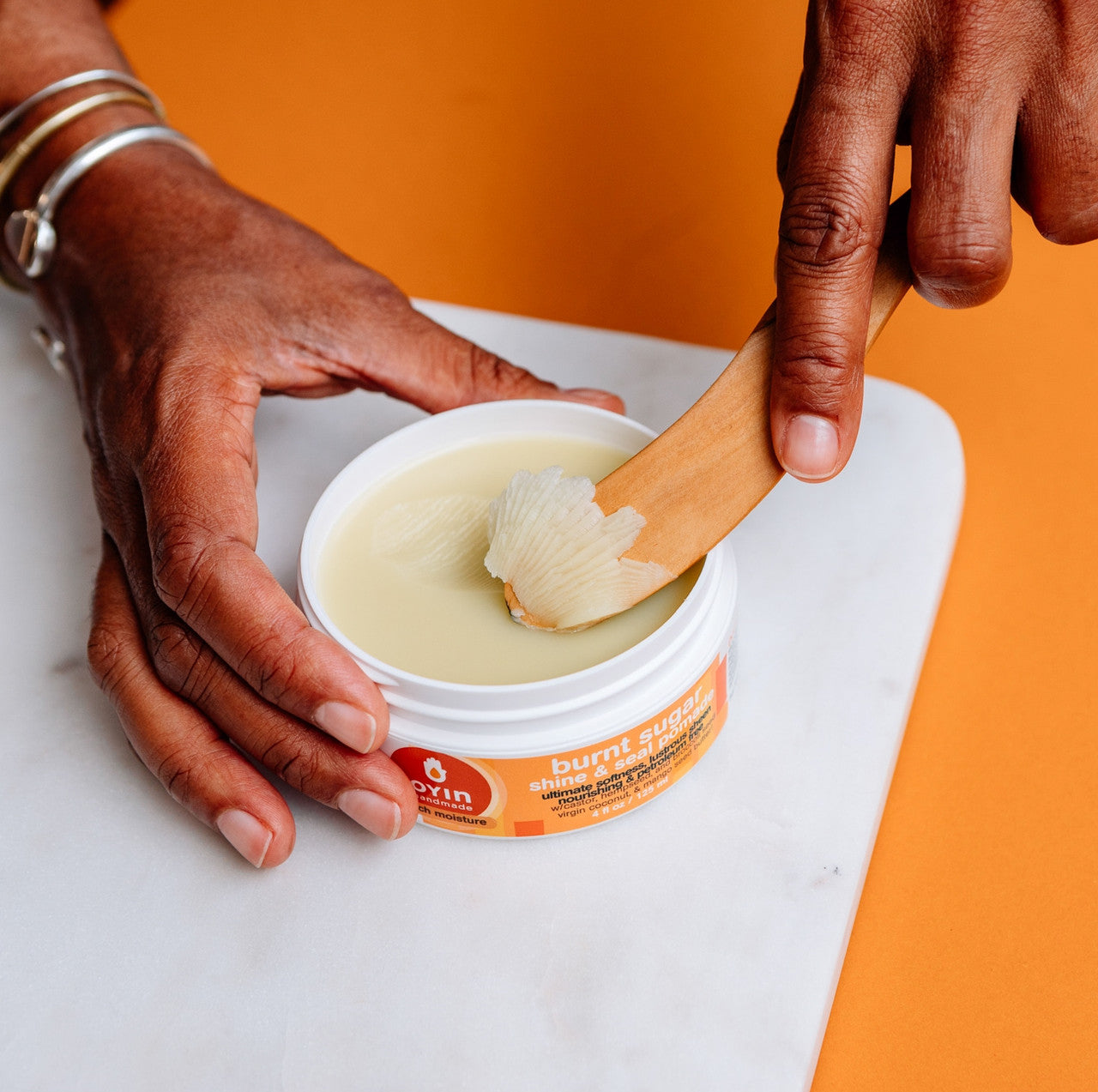 Our sugar pomades are petroleum-free, sheen-enhancing powerhouses that help shine & seal your hair. Formulated with castor, unrefined hempseed, and broccoli seed oil, our pomades are the perfect final step over a liquid or cream moisturizer in your natural moisture retention regimen. This completely vegan blend of oils, butters, and veggie waxes acts as humectant and protectant for hair, increasing shine to a high glossy sheen, locking in moisture.