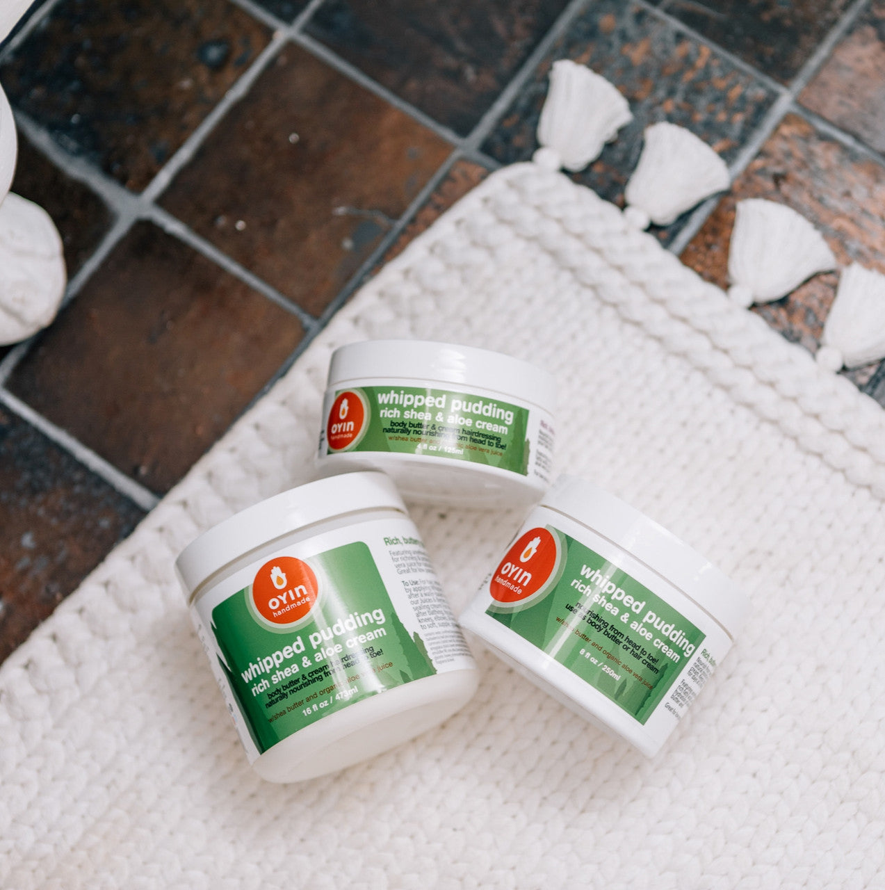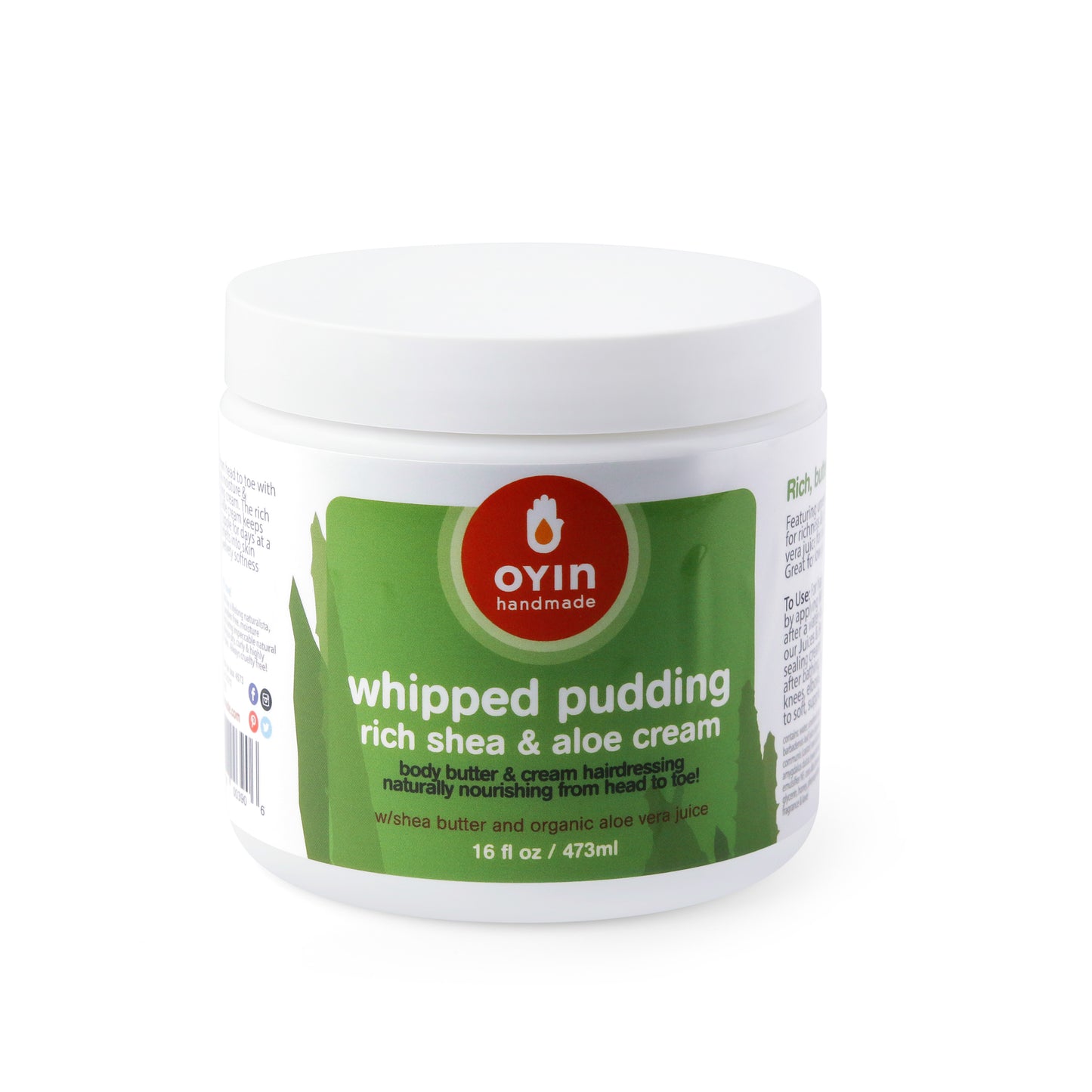 Ingredients:Whipped Pudding contains: water, shea butter, organic aloe vera gel, cocoa butter, castor oil, coconut oil, sweet almond & olive oils, vegetable emulsifier, beeswax, palm stearic acid, vegetable glycerine, honey, optiphen (preservative), fragrance.